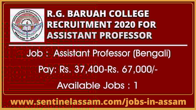 আর জি বরুয়া কলেজ বাংলা বিভাগে অ্যাসিস্টেন্ট প্ৰফেসর পদের জন্য উপযুক্ত যোগ্যতা থাকা প্ৰার্থীদের কাছ থেকে আবেদনপত্ৰ আহ্বান করেছে।