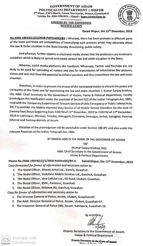 আজ (বুধবার) সন্ধে ৭টা থেকে অসমের ব্ৰহ্মপুত্ৰ উপত্যকায় ২৪ ঘন্টার জন্য বন্ধ হচ্ছে ইণ্টারনেট সেবা। রাজ্য সরকার আজ সন্ধে ৭ টা থেকে লখিমপুর, ধেমাজি, তিনসুকিয়া, ডিব্ৰুগড়, চরাইদেউ, শিবসাগর, যোরহাট, গোলাঘাট, কামরূপ (মেট্ৰো) কামপুরে সন্ধে ৭ টা থেকে ইণ্টারনেট সেবা বাতিল ঘোষণা করে। অসমের পরিস্থিতির প্ৰ্তি লক্ষ্য রেখে এই পদক্ষেপ নিয়েছে রাজ্য সরকার।
