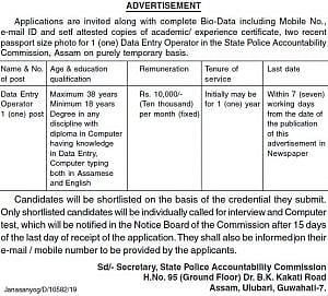 রাজ্য পুলিশ অ্যাকাউন্টেবিলিটি কমিশন,অসমে ডাটা এন্ট্ৰি অপারেটর পদে সম্পূর্ণ অস্থায়ী ভিত্তিতে নিয়োগের জন্য মোবাইন নন্বর,ই-মেইল আইডি এবং শিক্ষাগত যোগ্যতার সেলফ অ্যা্টাস্টেড কপি/অভিজ্ঞতার প্ৰমাণপত্ৰ,সম্প্ৰতি তোলা পাসপোর্ট সাইজের দুটো ফোটোগ্ৰাফ সমেত সম্পূর্ণ বায়োডাটার সঙ্গে আবেদনপত্ৰ আহ্বান করেছে।
